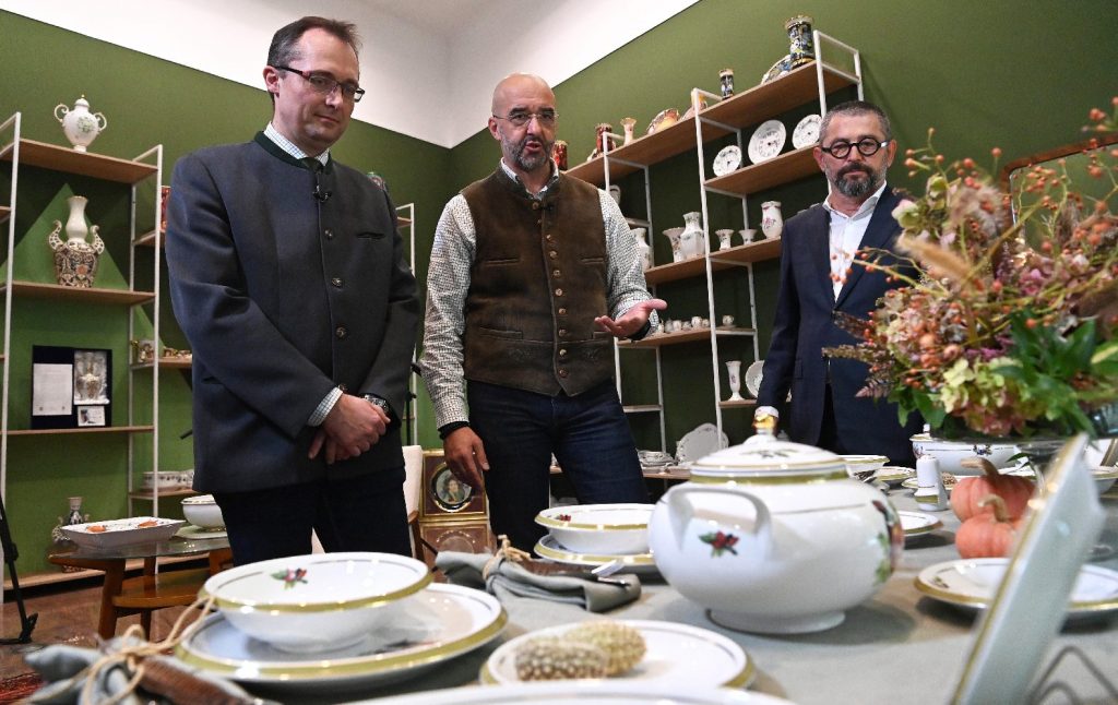 Boros Zoltán grafikusművész, a Nimród díszítés alkotója, Kovács Zoltán, a vadászati világkiállítás megvalósításáért felelős kormánybiztos és Várhegyi Attila, a Hollóházi Porcelánmanufaktúra Kft. ügyvezetője (b-j) a Nimród vadász asztali porcelánkollekció bemutatásán a manufaktúra mintaboltjában Budapesten 2021. szeptember 23-án. A porcelánkészletet az „Egy a természettel” Vadászati és Természeti Világkiállításra készítették el (Fotó: MTI/Illyés Tibor)
